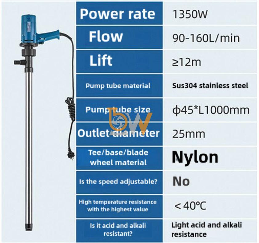 Ưu điểm của chất liệu SUS304 trên thân Bơm điện hút thùng phuy JDT-1350W-SUS304N nằm ở độ bền cao, khả năng chống ăn mòn và đảm bảo an toàn khi làm việc với nhiều loại chất lỏng khác nhau.