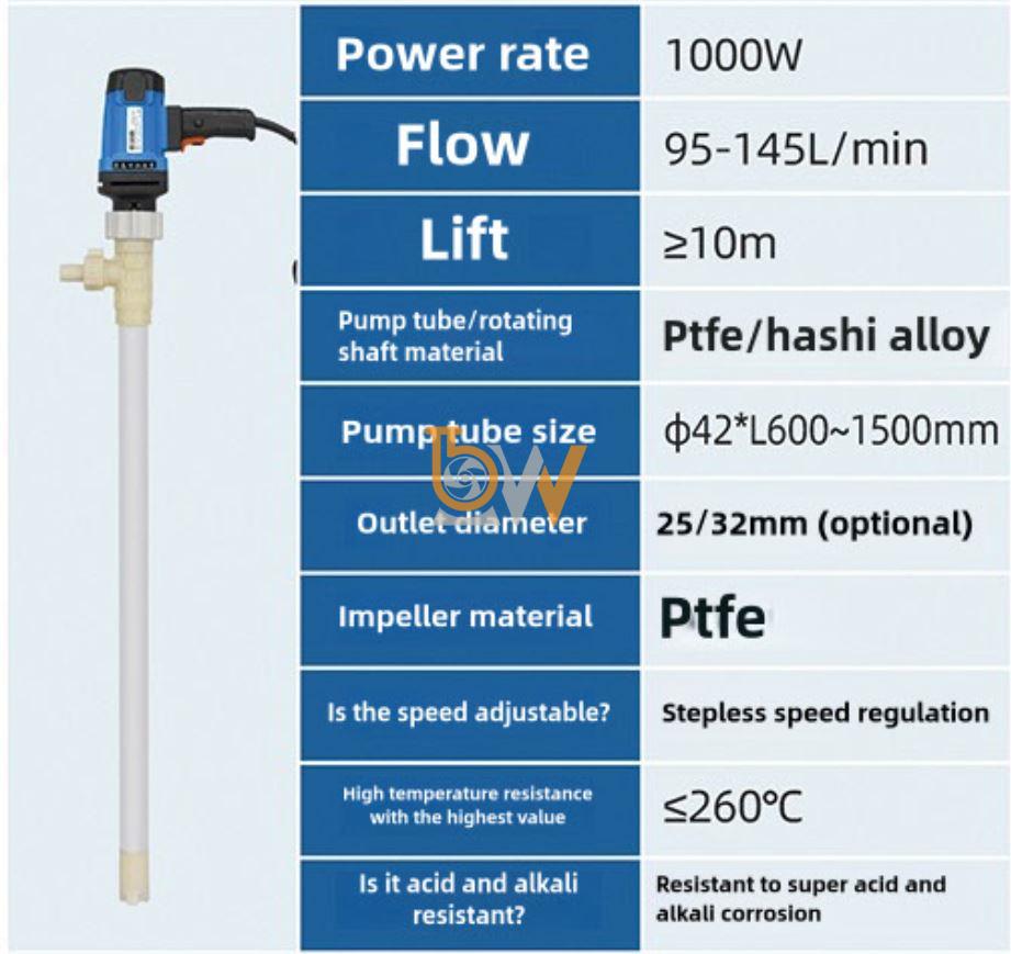 Bơm điện nhúng thùng phuy hóa chất chống ăn mòn model JDT-1000W-PTFE cho các chất lỏng nguy hiểm và độc hại là giải pháp chuyên dụng, đáp ứng đầy đủ các yêu cầu về an toàn, độ bền và hiệu quả khi xử lý hóa chất ăn mòn và độc hại. Với thiết kế nhúng thùng phuy, vật liệu PTFE cao cấp và khả năng kiểm soát dòng chảy ổn định, sản phẩm giúp giảm thiểu rủi ro, bảo vệ người vận hành và đảm bảo quá trình làm việc với hóa chất nguy hiểm diễn ra an toàn, hiệu quả và bền vững