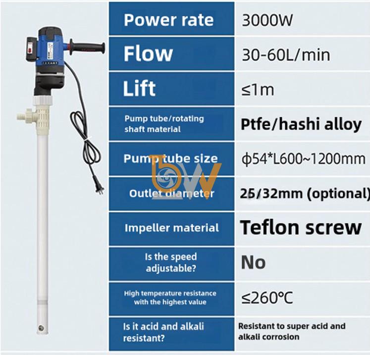 Bơm hút dầu nhớt thùng phuy JDT-3000W-PTFELG có ống bơm dài và thiết kế thon gọn, phù hợp với các thùng phuy tiêu chuẩn được sử dụng phổ biến trong kho dầu khí.
