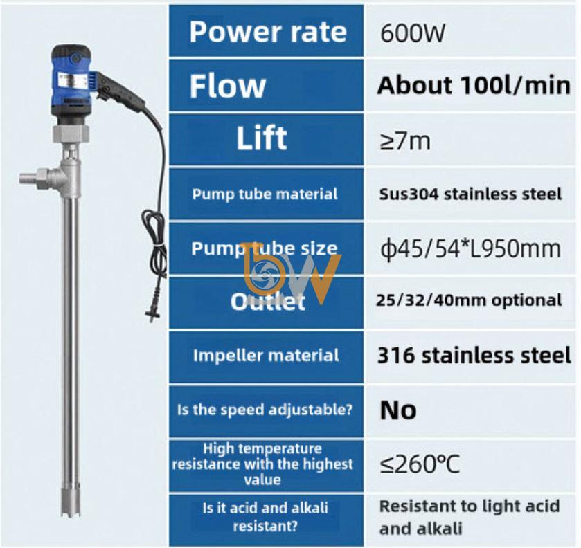 Bơm chìm hút thùng phuy nhiệt độ cao JDT-600W-G260 là lựa chọn tối ưu cho các doanh nghiệp cần xử lý chất lỏng nóng, hóa chất, dung môi hoặc dầu truyền nhiệt ở nhiệt độ cao. Với thiết kế hiện đại, vật liệu bền bỉ và khả năng vận hành mạnh mẽ, thiết bị mang lại nhiều lợi ích vượt trội so với các dòng bơm thông thường.
